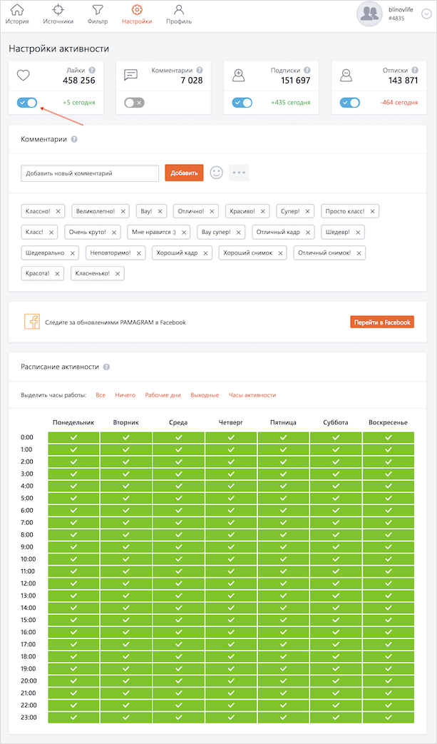Также здесь настраивается расписание активности. Оно нужно, чтобы указать определенные часы, в которые будут совершаться действия. Это необходимо, если вы хотите, чтобы сервис совершал максимум действий в определенное время.