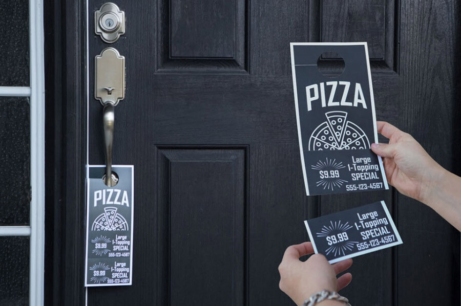 Пиццерия. Реклама в виде подвески на дверь с отрывными купонами для заказа пиццы по сниженной цене.