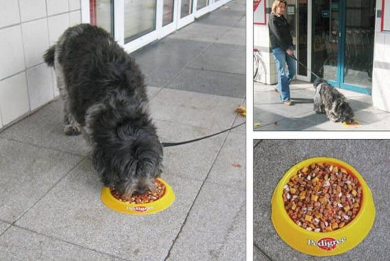 Pedigree. На асфальте не миска с собачьим кормом, а просто наклейка. После обработки ароматизатором она будет привлекать внимание собак и их владельцев.