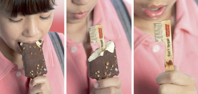 Colgate провела совместную акцию с производителем мороженого. Роль основы для эскимо во всей партии играла деревянная палочки в виде зубной щётки с надписью «Не забудь о Colgate!».