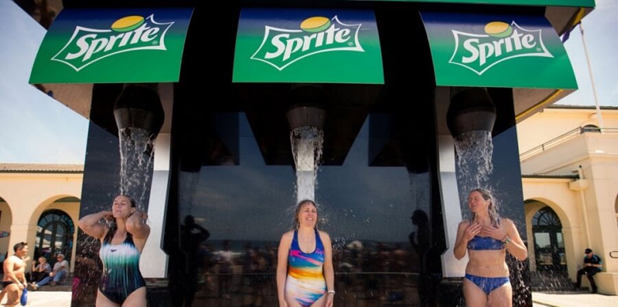 Ещё один пример. Торговая марка Sprite сделала пляжный душ в виде автомата с лимонадом — цель ассоциироваться со свежестью и прохладой в жаркий день.