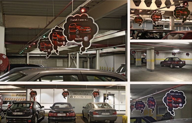 На парковке. Немецкая компания Volkswagen проводила рекламные акции на парковках. Когда водитель возвращался, то видел над машиной «мысленный пузырь» с текстом «Я бы хотел быть новым GTI» и изображением новой модели авто.