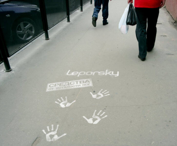 На асфальте. Пример от российского магазина косметики Leporsky Esthetique. Фирма креативно прорекламировала средства от усталости ног, не забыв упомянуть название бренда.