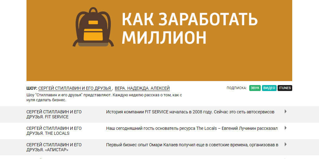 Подкасты выкладываются каждую неделю на радио «Маяк» в рамках шоу «Стиллавин и его друзья». Здесь обсуждают истории об успешном запуске бизнеса с нуля. Послушать можно на сайте радио.