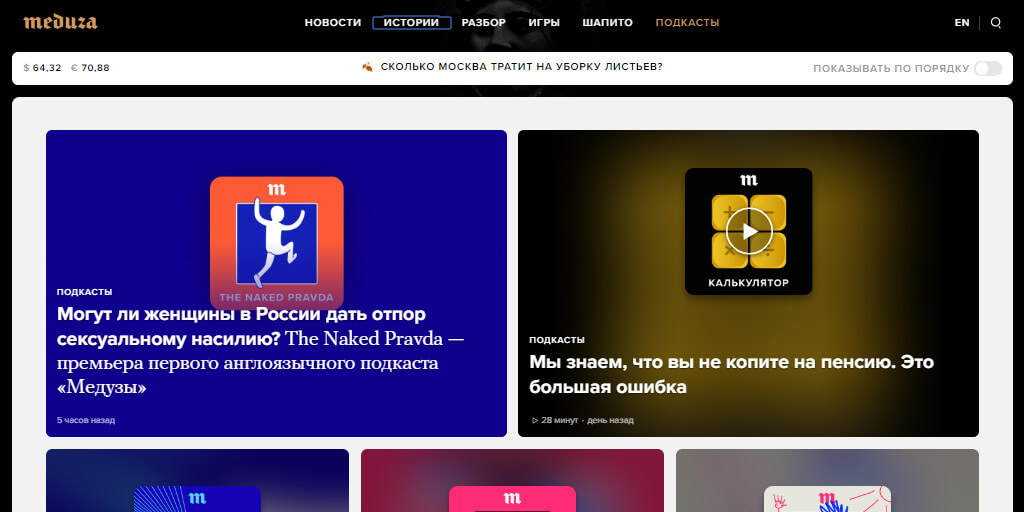 Meduza – это агрегатор новостей на русском языке. Периодически СМИ выпускает собственные материалы. В месяц выходит около 30 подкастов. Их можно найти на официальном сайте издания.