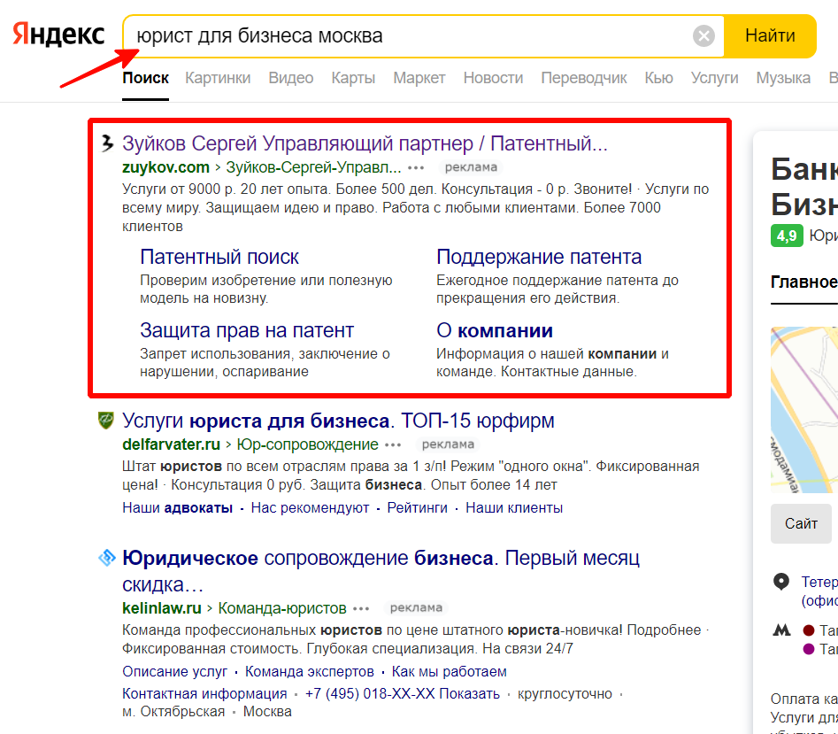 В запросе речь идет о юристе для бизнеса, а в объявлении – про патентного поверенного. Конечно, это тоже касается услуг для фирм, но это предложение с очень ограниченной ЦА и в объявлении нет ключевых слов из запроса.