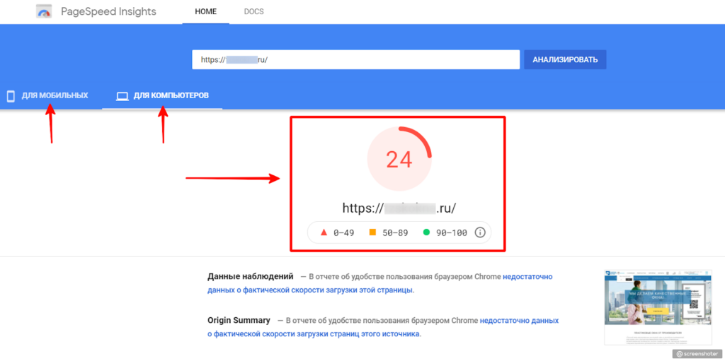 - оценку скорости загрузки на смартфонах и компьютерах с расшифровкой;