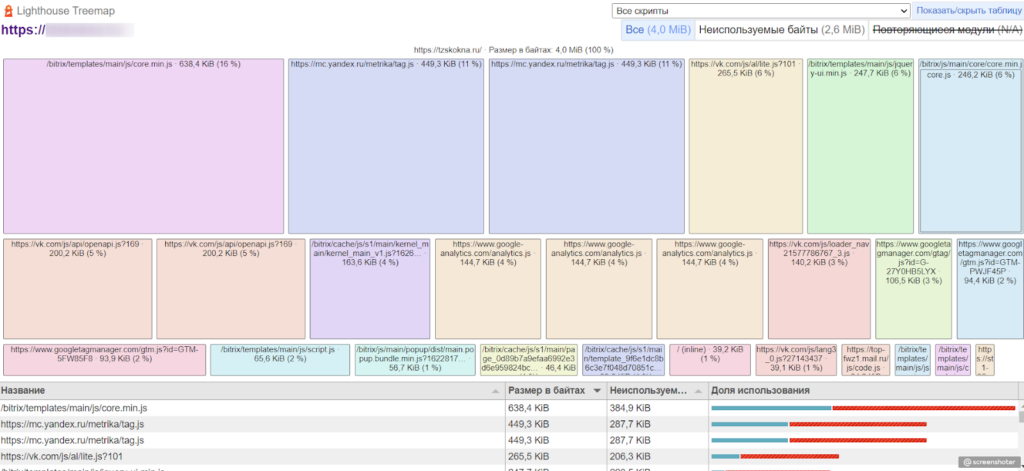 - карту эффективности с детальными данными о том, как на скорость влияет каждый из скриптов.