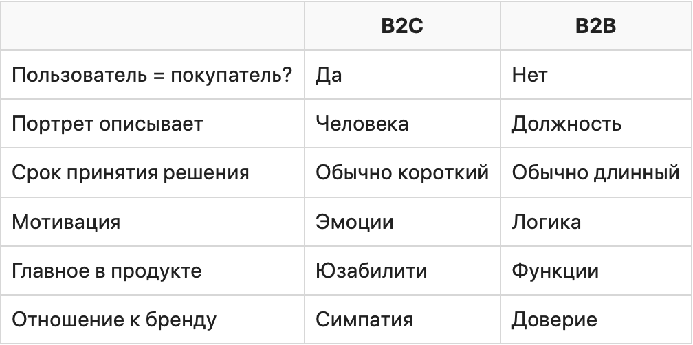 Эта статья разбирает отличия целевых пользователей в B2С- и B2B-сегментах. Они помогут вам структурировать информацию о клиентах и составить основу для портрета своего идеального покупателя.
