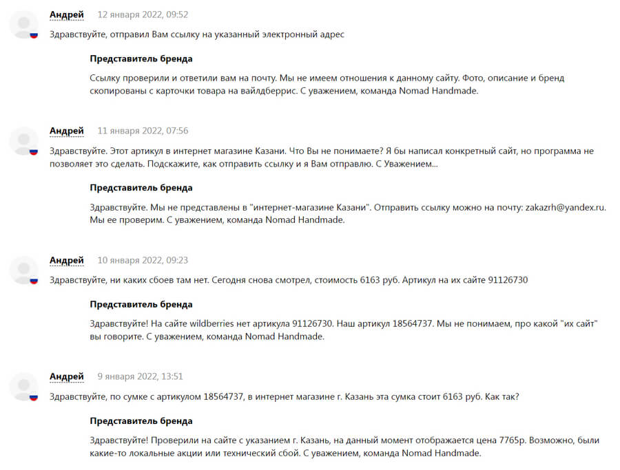 Особенно стоит отслеживать, если кто-то пишет об аналогичном товаре в другом магазине. Или предъявляет вам претензии на товар, который куплен вне Вайлдберриз у другого продавца. Пример — интернет-магазин в Казани скопировал название, описание и фото товара из ВБ и выложил в своем магазине под другой ценой. Пользователь требует объяснить, почему такие отличия в стоимости. Имейте ввиду, что пользователи не всегда ведут себя корректно, но вы как представитель бренда, обязаны отвечать спокойно и вежливо. У пользователей есть возможность пожаловаться на ответ продавца, и эти жалобы плохо отразятся на продвижении.