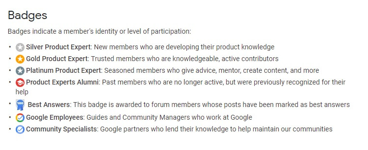 Кроме пользовательских бейджей, есть бейджи специалистов и менеджеров Google, а также значок, которым помечается лучший ответ.