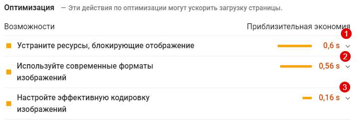 В этом блоке представлена информация по производительности веб-ресурса и ряд рекомендаций. Элементы списка раскрываются.