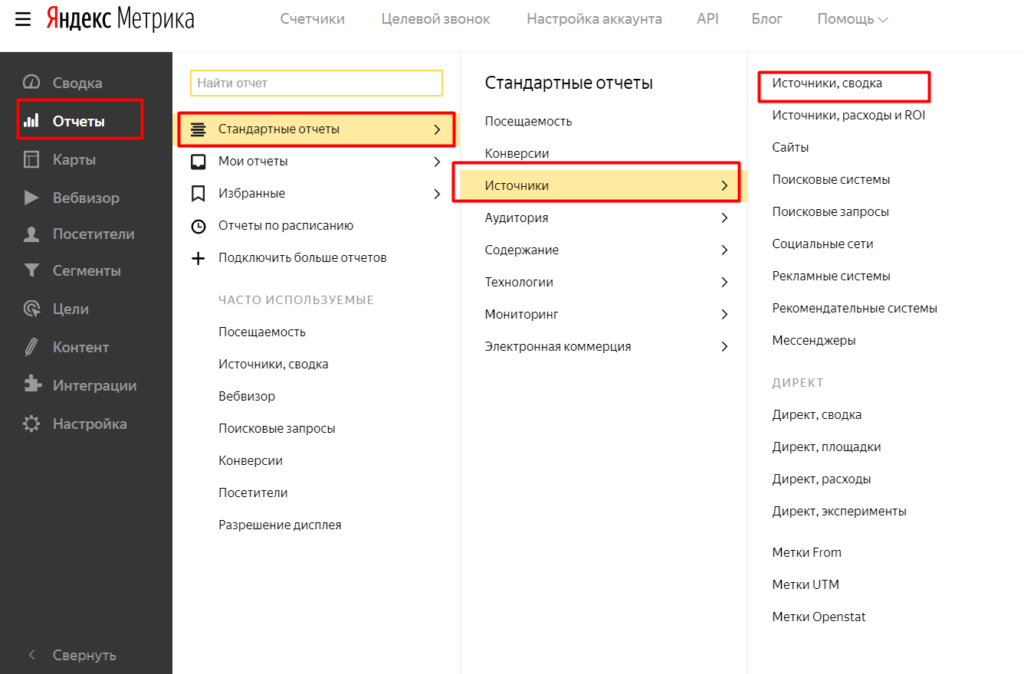 В Яндекс.Метрике эти данные доступны в отчете «Источники, сводка». Чтобы в него попасть, перейдите в «Отчеты» → «Стандартные отчеты» → «Источники» → «Источники, сводка».