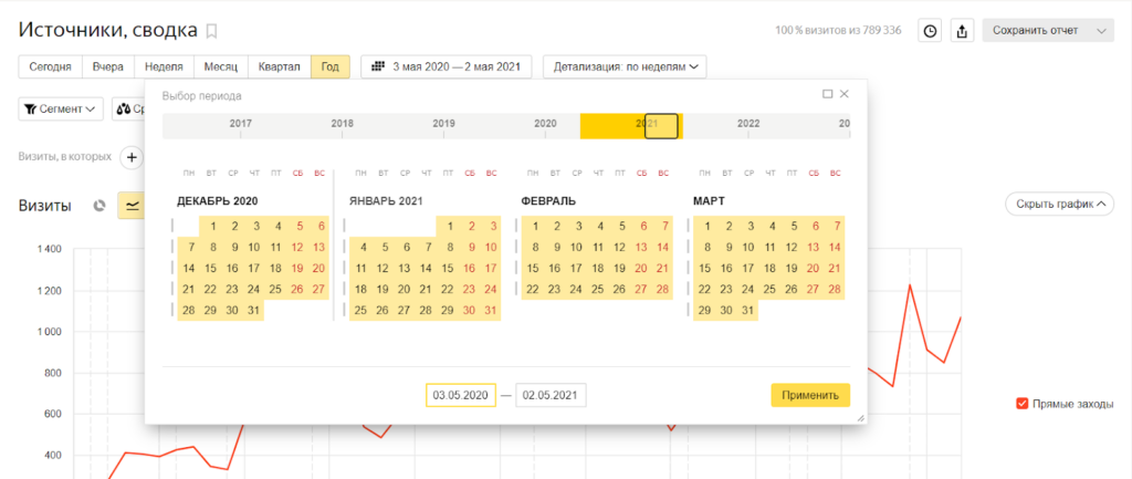 Можно задать произвольный период или выбрать предустановленные варианты: сегодня, вчера, неделя, месяц, квартал или год.