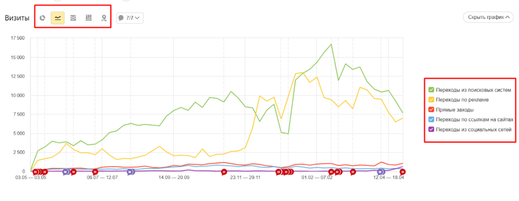 Вверху над графиком можно переключить варианты отображения (круговая диаграмма, линейный график, области, колонки или карта). Справа отмечены типы источников, которые включены в график.