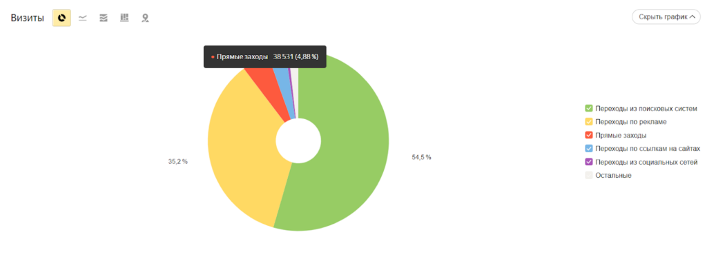 Посмотреть, какую долю занимают прямые заходы в общем трафике сайта, удобнее всего на круговой диаграмме.