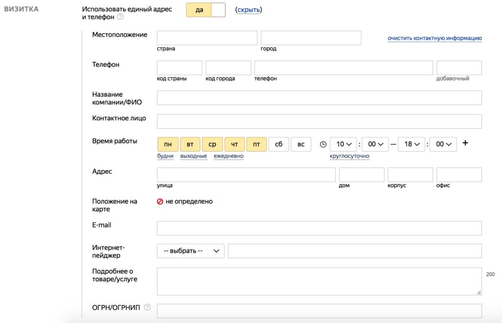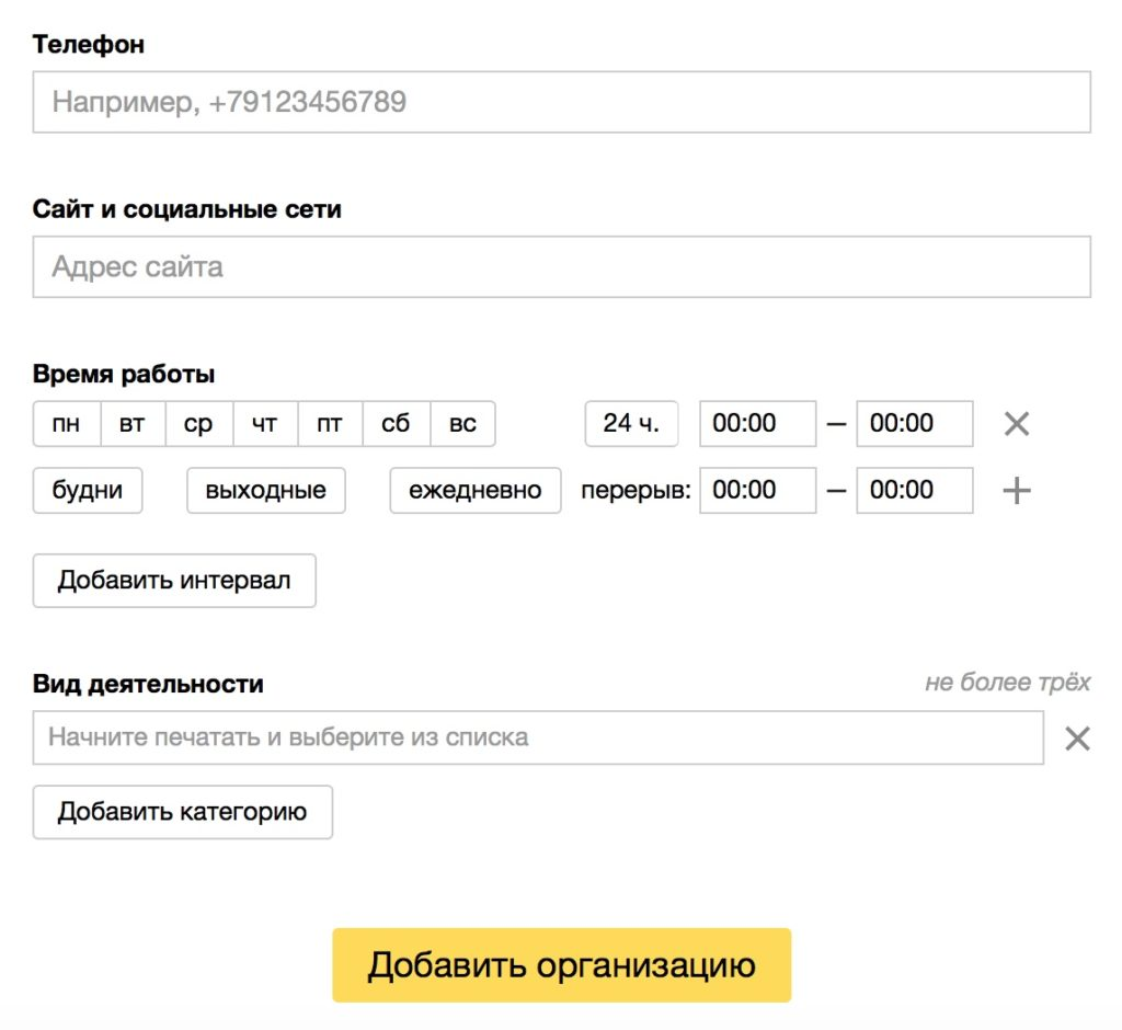 Яндекс даже готов добавить в Справочник организацию, у которой нет физического адреса. В этом случае компания не будет видна на картах, останется только красивая карточка в выдаче.