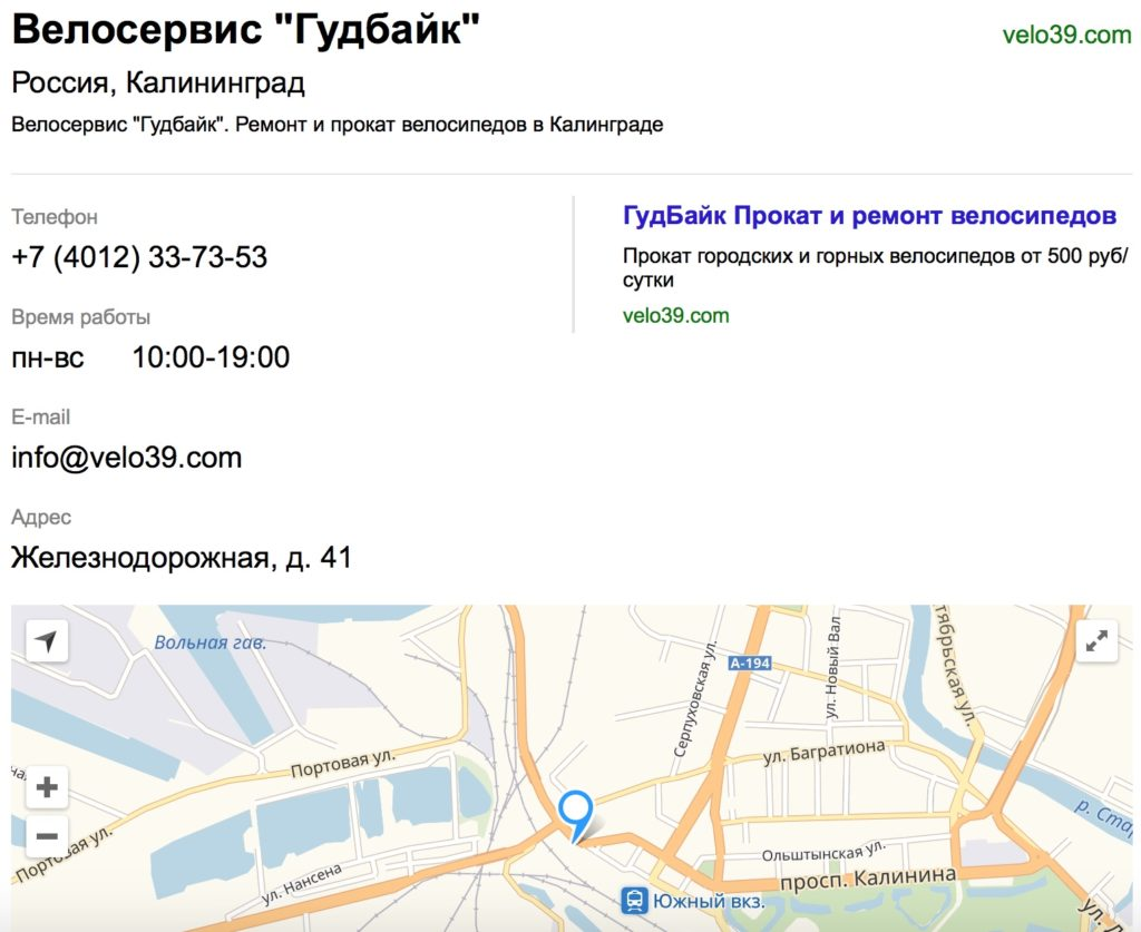 Эта информация добавится к рекламному объявлению. А если указать ещё и адрес, то компанию можно будет отметить на Яндекс.Картах. Как выглядит правильно заполненная визитка компании: