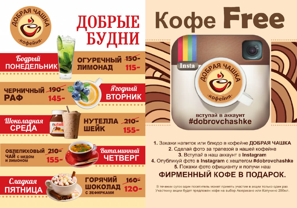 В кофейне «Добрая чашка» вы получите фирменный кофе в подарок, если подпишитесь на Инстаграм компании, а также сделаете фото в заведении и выложите его с соответствующим хештегом. Это лучшая живая реклама при минимальных затратах!