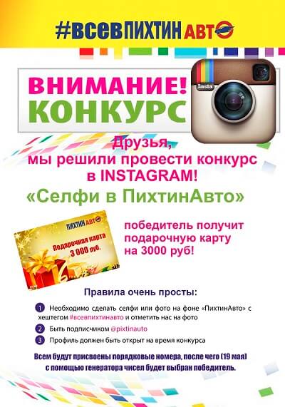 Автофирма «Пихтин Авто» предложила сделать клиентам селфи или обычный снимок на фоне автомобильного комплекса компании. Каждому участнику требовалось выложить фото в Инстаграм с соответствующим хештегом – это увеличило узнаваемость бренда и повысило лояльность к нему.