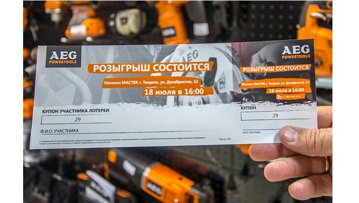 Если речь идёт об офлайн-мероприятиях, можно поступить как производитель электроинструментов AEG POWERTOOLS. На протяжении месяца компания выдавала клиентам, совершившим покупку на определённую сумму, купоны участников, а затем провела розыгрыш призов в одной из своих торговых точек.