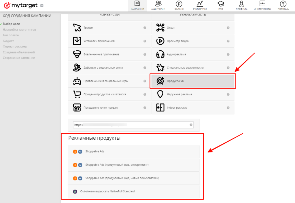 Для настройки через рекламный кабинет myTarget нужно выбрать пункт «Продукты VK» в столбце «Узнаваемость», а затем спуститься ниже и кликнуть на один из трех продуктов со словами Shoppable Ads: