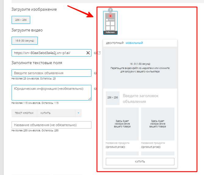 Объявления при работе с помощью фида будут выглядеть точно так же, как и при ручном добавлении, однако в окне предпросмотра вы сразу увидите изображения товаров, останется только подгрузить видео длиной до 30 секунд и заполнить текстовые поля (заголовок объявления, обязательная юридическая информация).