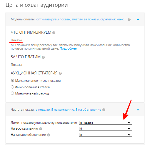Несмотря на то, что формат позиционируется в том числе как продающий, в настройках по умолчанию установлена оплата за показы (максимальное количество по минимальной цене). Можно скорректировать аукционную стратегию, выбрав фиксированную ставку или минимальный расход. Будет нелишним задать и ограничения на показы уникальному пользователю, чтобы не тратить бюджет впустую и не вызывать раздражения у аудитории.