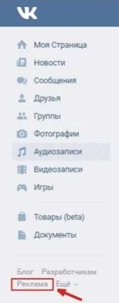 На главной странице профиля слева пролистнуть меню до строчки Реклама, которая выделена серым оттенком.