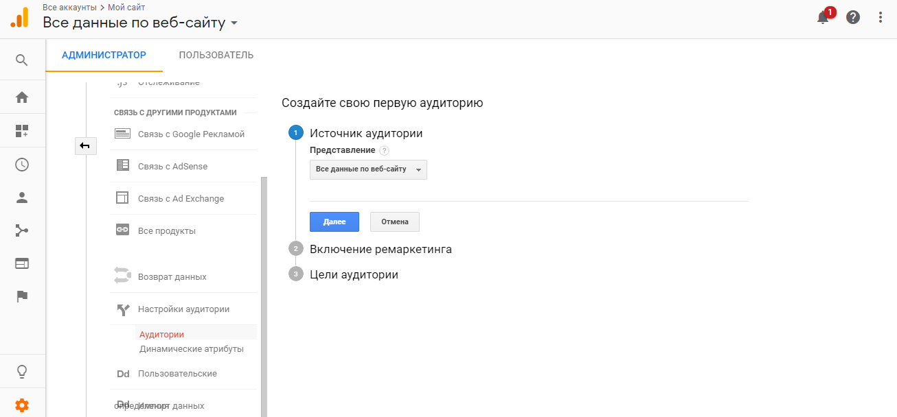 Тем, кто ранее не настраивал ремаркетинг, сервис автоматически предложит создать первую аудиторию.