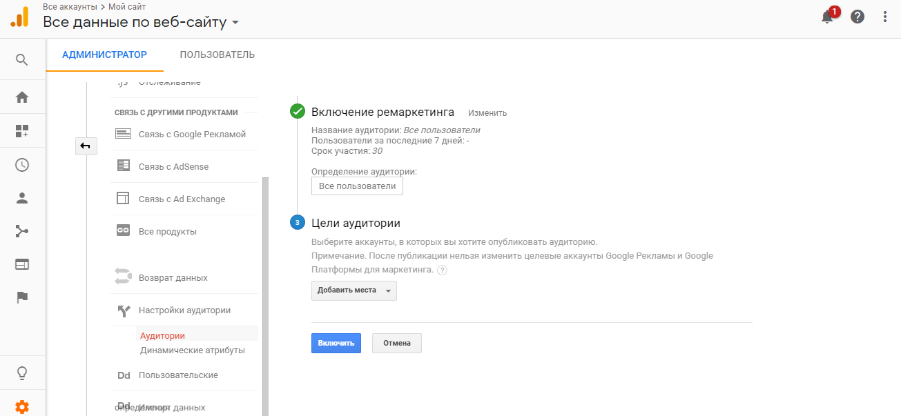 После того как вы укажете источник аудитории, нужно включить ремаркетинг. При сборе первой аудитории настройки выставлены по умолчанию — будут учитываться данные всех посетителей сайта за месяц. Позднее вы сможете скорректировать выставленные изначально настройки.