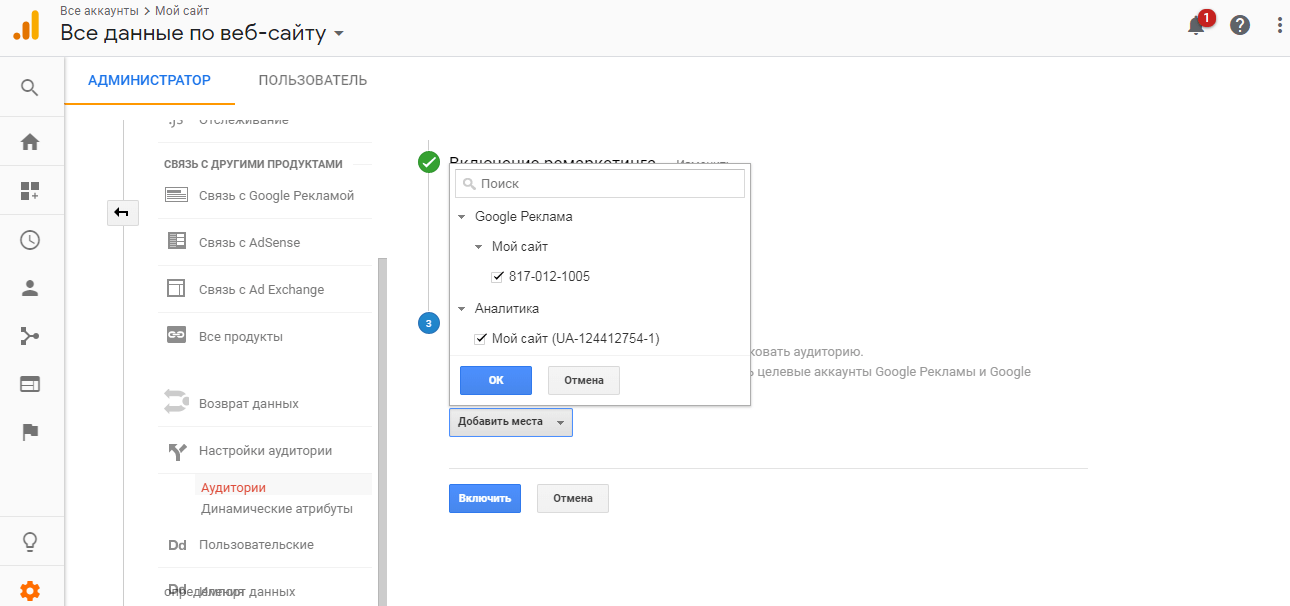 Перед настройкой необходимо связать аккаунты в Google Analytics и в Google AdWords. Когда аккаунты будут привязаны, можно переходить к настройке.