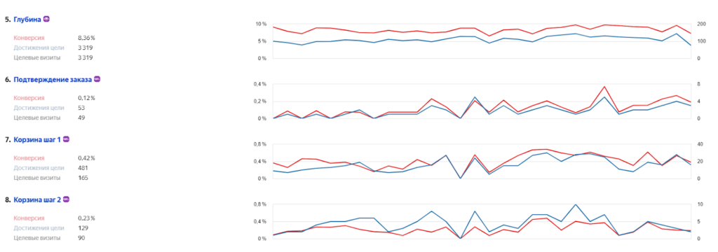 Так выглядят графики в разделе «Конверсии» в Метрике, когда данные по целям активно собираются: