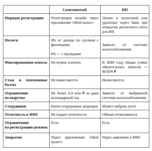 Ознакомьтесь с таблицей, чтобы понять, что выгоднее — быть самозанятым или ИП: