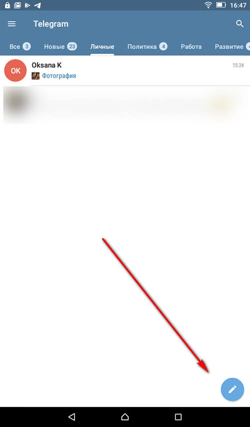 Шаг 1. Открываем приложение Телеграм на мобильном устройстве. Нажимаем на значок карандаша — он позволяет начать переписку.