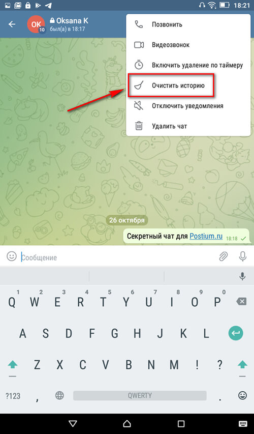 Шаг 7. При желании можно удалить историю чата вручную. Для этого снова заходим в меню и выбираем «Очистить историю».
