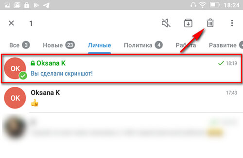Шаг 9. Удаляем сам чат. Его можно удалить из общего списка чатов или внутри секретного чата. Чтобы удалить из общего списка, удерживаем чат, пока сверху не появится панель инструментов. Находим значок корзины и кликаем на нее.