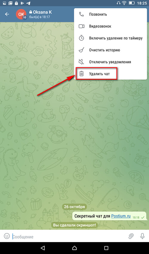 Чтобы удалить чат изнутри, открываем его меню и жмем на кнопку «Удалить чат».