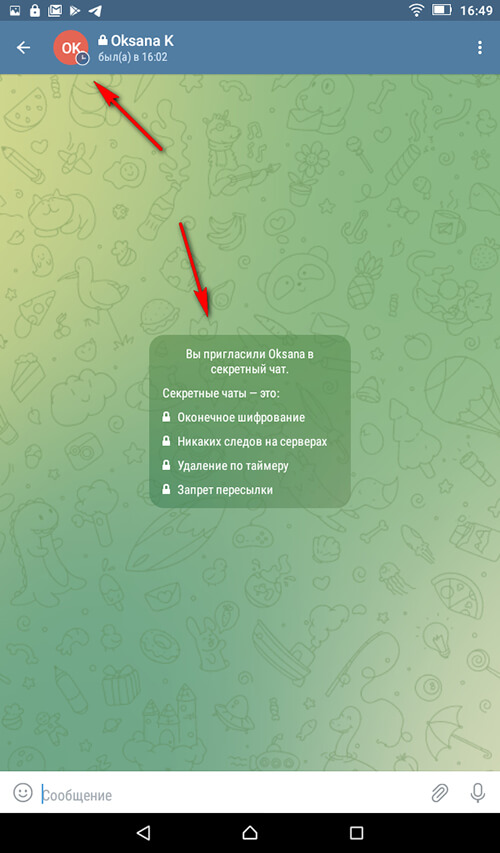 Шаг 4. Приветственное окно показывает нам, что это секретный чат. Напротив имени собеседника виден замочек и знак часов.