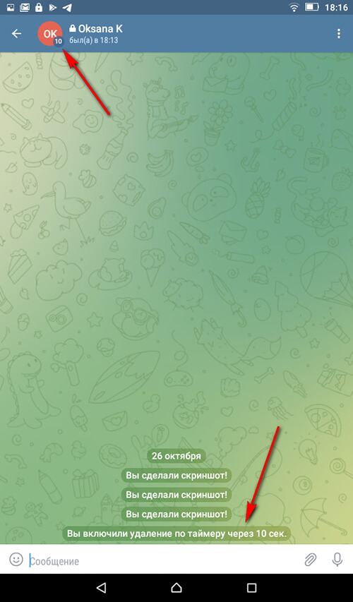После установки таймера в окне чата появится соответствующее уведомление. Напротив имени собеседника также появится кружочек с количеством установленных секунд, минут или дней. В примере установлен таймер на 10 секунд.