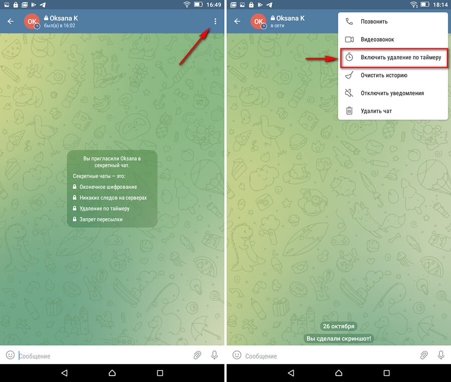 Шаг 5. Если нужно, настраиваем таймер на автоудаление сообщений. По умолчанию он отключен. Жмем на 3 точки в правом верхнем углу, чтобы вызвать меню чата. Нажимаем «Включить удаление по таймеру».