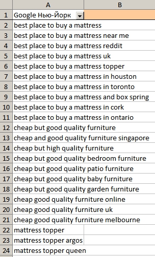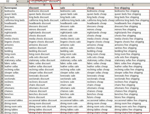 - Соберите список названий товарных категорий магазина («bedrooms», «mirrors», «nightstands», «chairs» и т.д.). Этот список удобнее всего выгрузить из CMS в Excel-файл.