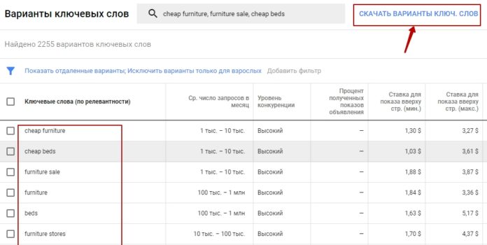 Мы добавили три запроса, Планировщик подобрал по ним более двух тысяч вариантов ключевых слов. Этот список нужно выгрузить для корректировки. Выгрузку ключевых слов из Планировщика можно сделать в формате CSV.