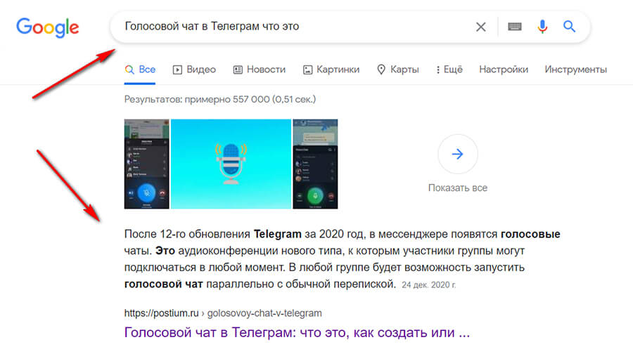 SEO-текст — это текст, который оптимизирован под требования поисковиков и отвечает на вопрос пользователя. Если человек пишет в поиске запрос «Как создать голосовой чат в Телеграм» — он хочет получить инструкцию, где будет пошагово описан этот процесс со скринами. Чтобы после просмотра статьи можно было сразу запустить голосовой чат. Поисковик, в свою очередь, при помощи нескольких алгоритмов подбирает страницы и ролики из YouTube, в которых должен содержаться ответ на вопрос пользователя. Если после прочтения статьи про голосовые чаты посетитель пошел искать информацию дальше, значит, ему не хватило ответов.