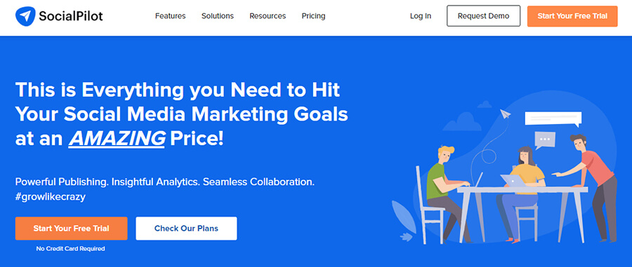 Socialpilot — комплексный зарубежный инструмент по работе с соцсетями. Кроме автопостинга здесь есть омниканальный мессенджер и инструменты аналитики.