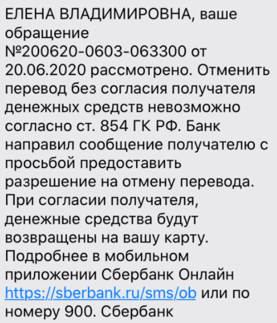 К сожалению, настоящие ошибки тоже встречаются и не всегда получается вернуть отправленные не туда деньги. Например, вот такой ответ получила Елена, когда ошиблась в одной цифре и перевела средства незнакомцу, который отказался их возвращать. В этом случае вопрос решается в полиции или через суд.