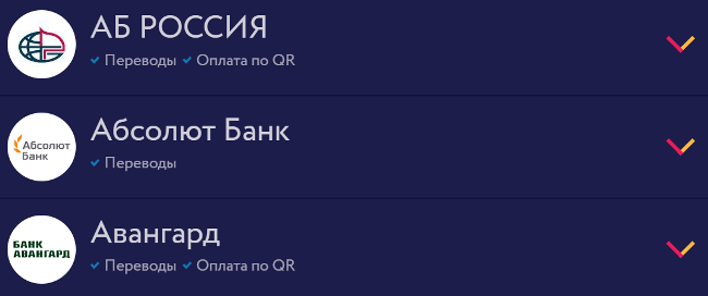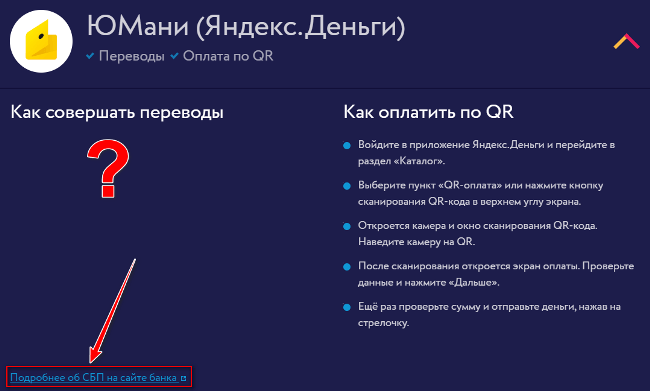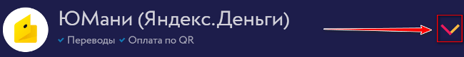 - Нашли ЮMoney (ЮМани) в списке. Убедились, что галочки стоят напротив “Переводы” и “Оплата по QR”. Нажали на галочку, которая стоит в строке каждого банка, для получения дополнительной информации.