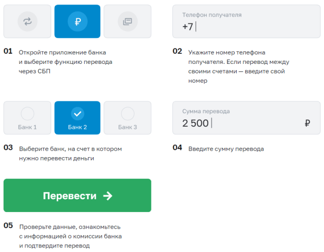 Чтобы отправить деньги с помощью этого сервиса, надо найти в приложении своего банка на смартфоне, компьютере или планшете соответствующую вкладку. Она не всегда очевидна. Например, в Тинькофф Банке это функция прячется в разделе “По номеру телефона”. Далее действуем по схеме.