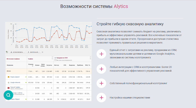 Позиционирует себя как сервис с лучшей автоматизацией контекстной рекламы. Alytics позволяет маркетологам: