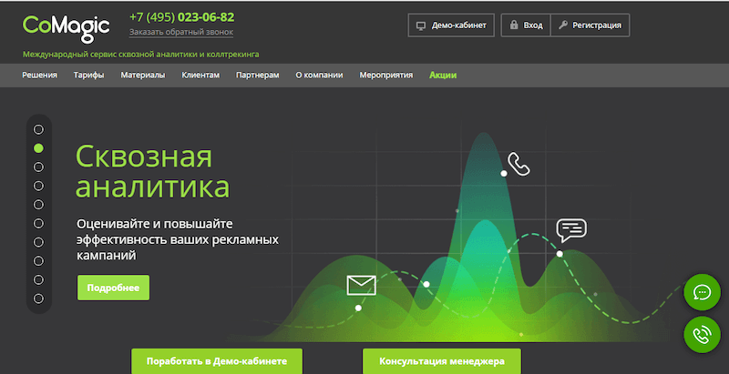 Популярный на российском рынке сервис включает в себя сквозную и речевую аналитику, коллтрекинг, генератор лидов и виртуальную АТС.
